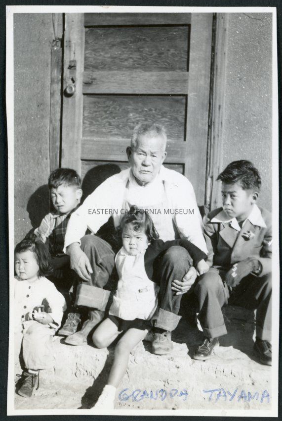 Photograph of Grandpa Tayama surrounded by four children in front of a door in Cow Creek Camp in Death Valley National Park. Incarcees were transferred to the former Civilian Conservation Camp after the Manzanar Riot for their own protection.Collection