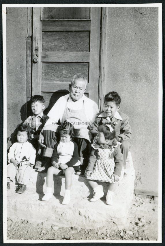 Photograph of Grandpa Tayama surrounded by five children in front of a door in Cow Creek Camp in Death Valley National Park. Incarcees were transferred to the former Civilian Conservation Camp after the Manzanar Riot for their own protection.Collection