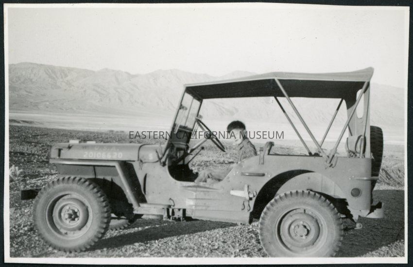 Photograph of a young boy sitting in an Army jeep in Death Valley National Park. Incarcees were transferred to the former Civilian Conservation Camp after the Manzanar Riot for their own protection.Collection