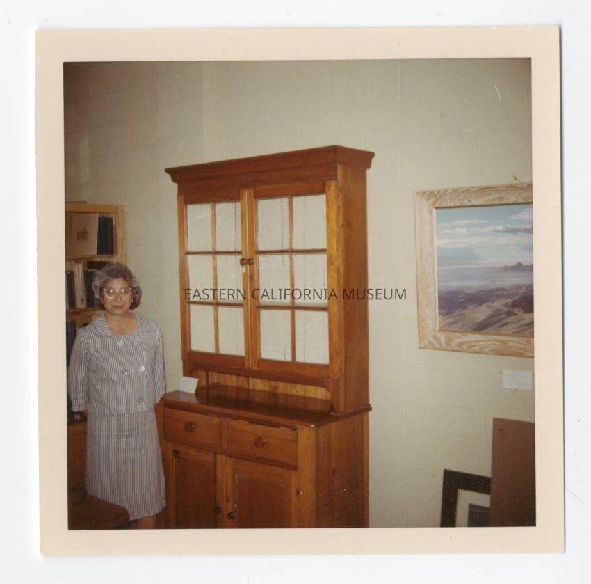 Small color photo of an unidentified woman standing next to a wood hutch. Hanging on the wall next to hutch is a Stephen Willard painting of Death Valley (A655.1). Photo appears to have been taken inside the museum.Collection