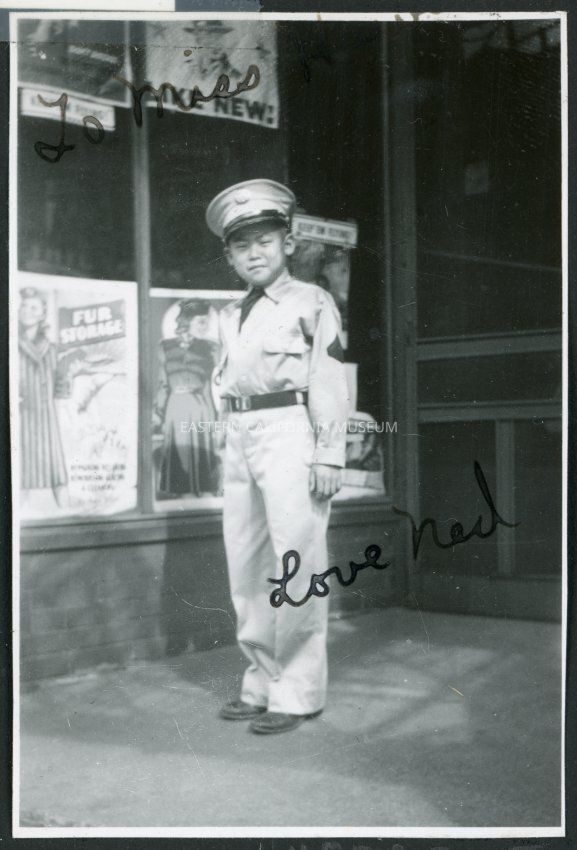 Photograph of Ned Morioka posing in front of a storefront wearing an uniform with a hat. Advertisements can be seen in the glass. The photograph is signed, "To Miss Hawes, Love Ned".Collection
