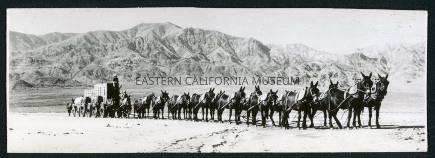 Photograph of the 20 mule team pulling the borax wagons in Death Valley National Park. A mountain range is visible in the background.Collection