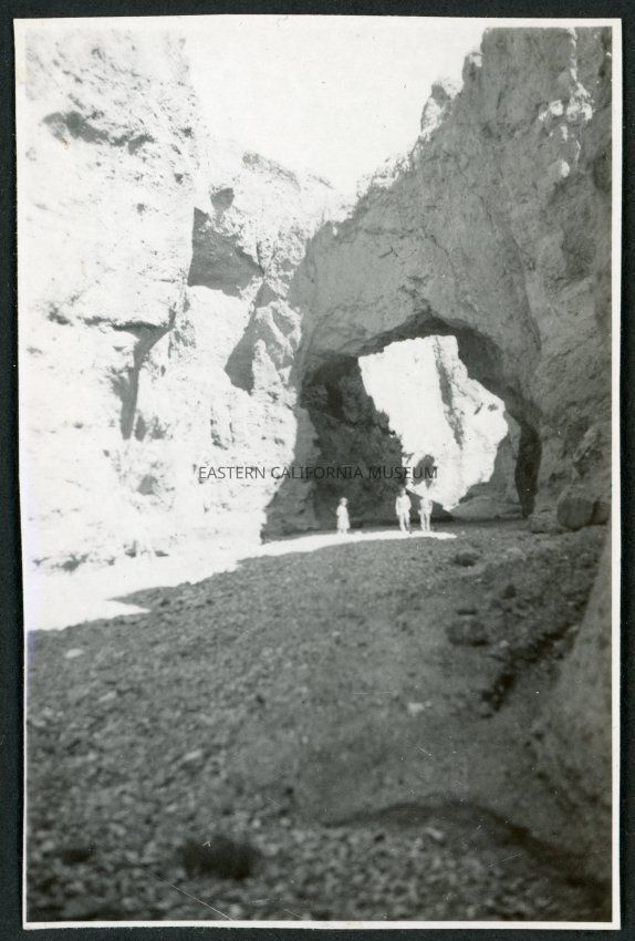 Photograph of three people walking under the Natural Bridge in Death Valley National Park. They are walking toward the camera.Collection