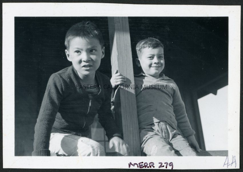 Photograph of two young boys taken at Manzanar. They are sitting next to a post supporting a roof.