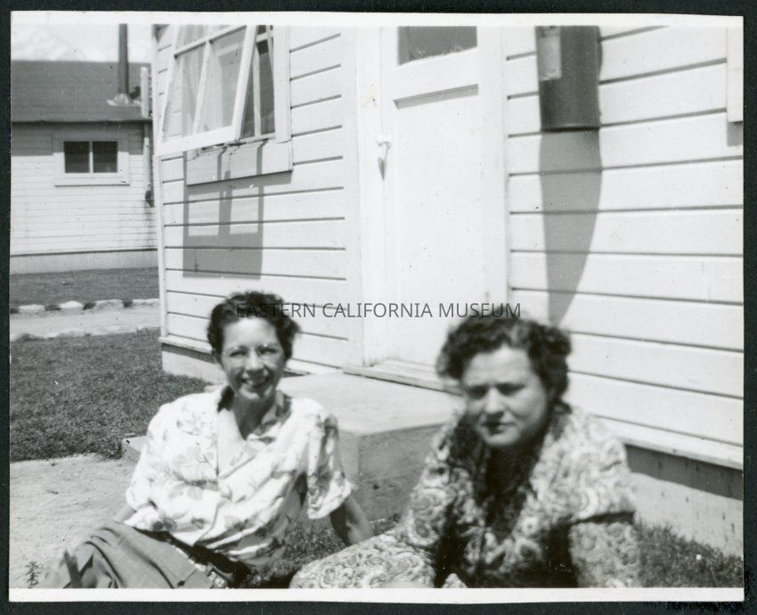 Photograph of Lucy Adams and Dagmar Quarnstrom sitting on the grass in front of staff housing at Manzanar Incarceration Camp. Lucy is out of focus.Collection