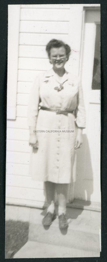 Photograph of Martha Shoaf in front of staff housing at Manzanar Incarceration Camp. She is standing on front step next to a door.Collection