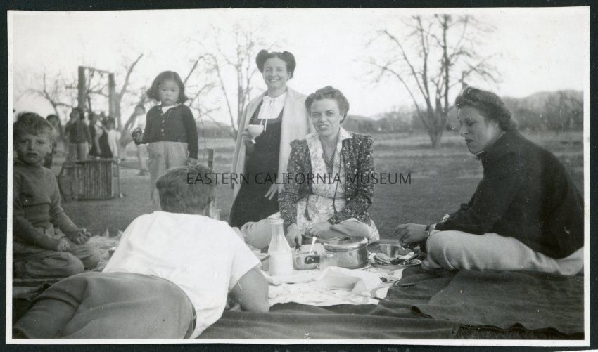 Photograph of a group of people enjoying a Sunday dinner as a picnic at one of the parks at the Manzanar Incarceratino Camp. The group consists of two children, three women and a man. There is another group of children in the upper left corner.Collection