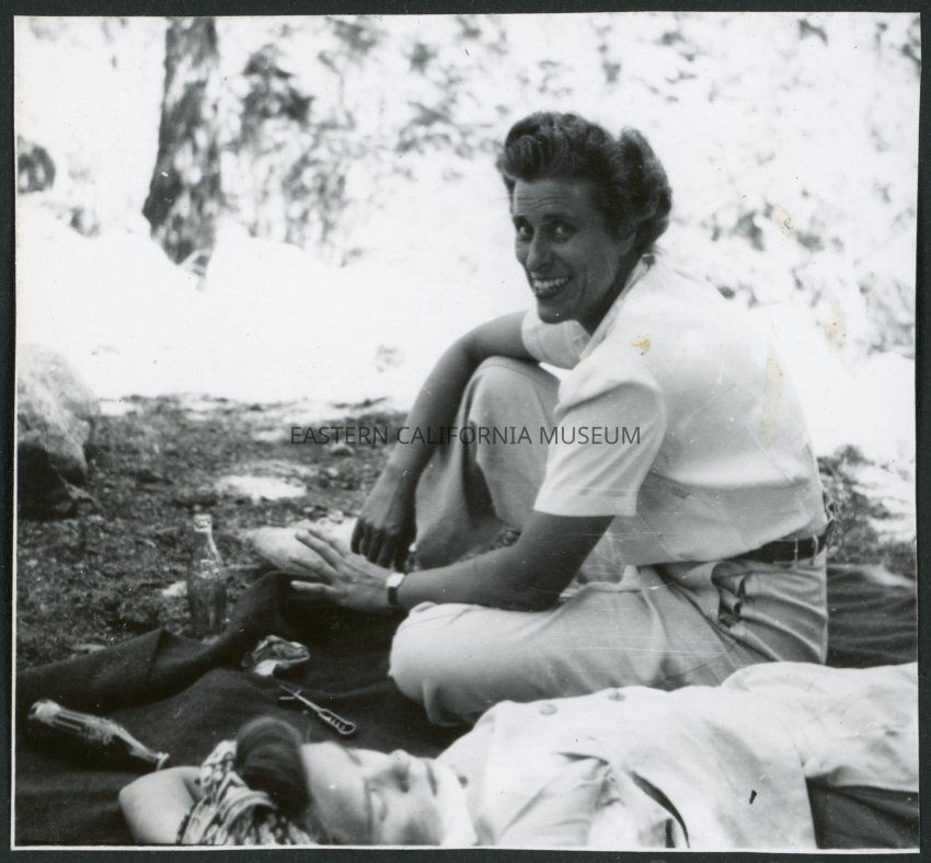 Photograph of two women near Manzanar Incarceration Camp enjoying a hospital staff picnic. They are resting on a blanket.Collection
