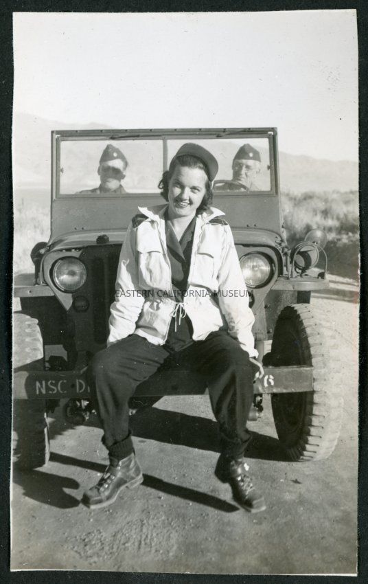 Photograph of Cleo Merritt sitting on the front bumper of an Army jeep with two men sitting in the front seats near the Manzanar Incarceration Camp. In the background are the Inyo mountains.Collection