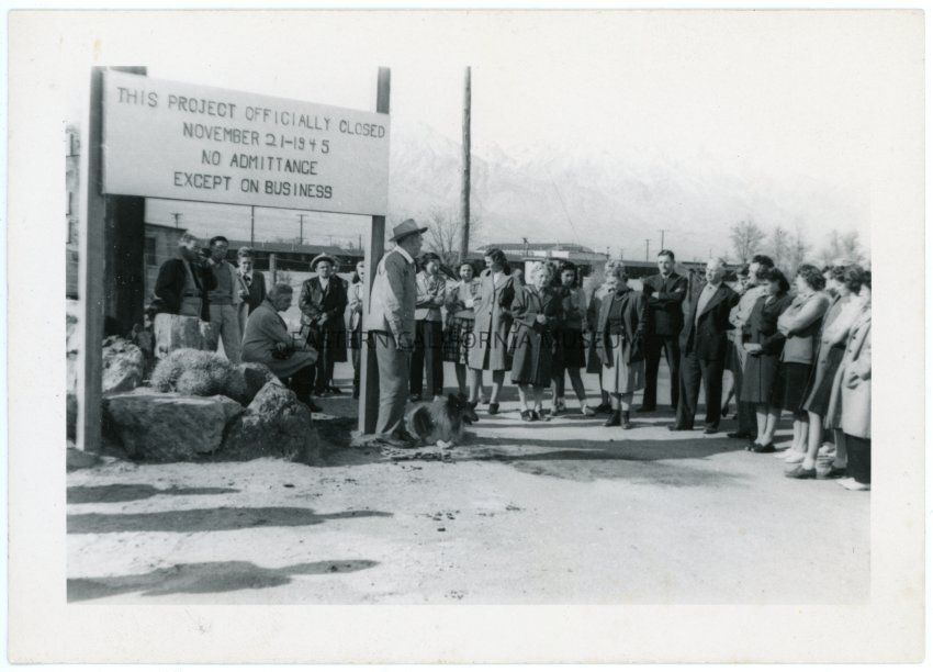 Photograph of Manzanar Incarceration Camp closing taken in front of the official closure notification and the entrance sign. Ralph P. Merritt is standing next to the closed sign with his dog Sandy. A large group of people surround him.Collection