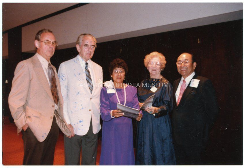 Photograph of Ralph "Pete" Merritt, the son of the project director at the Manzanar Incarceration Camp, and four other indviduals at the Manzanar 40th Reunion. The two women in the center are holding a program in their hands.Collection