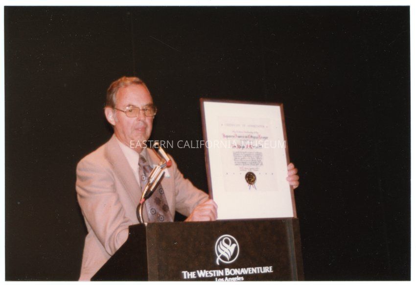 Photograph of Ralph "Pete" Merritt, the son of the project director at the Manzanar Incarceration Camp, standing behind a podium at the Manzanar 40th reunion. He is holding a framed certificate addressed to his father, Dr. Ralph P. Merritt from the Japanese American Citizens League.Collection