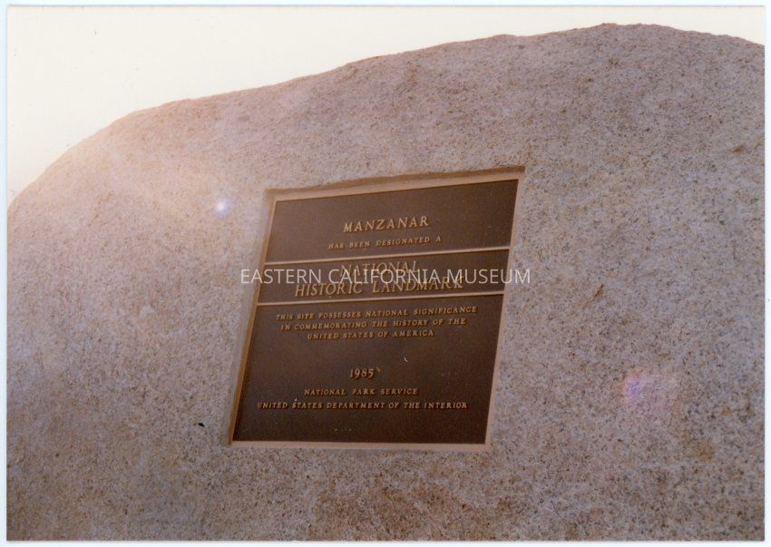 Photograph of the plaque marking the Manzanar Incarceration Camp as a National Historic Landmark. The stone it is set into fills the frame and the sun is creating several rays across the photograph.Collection