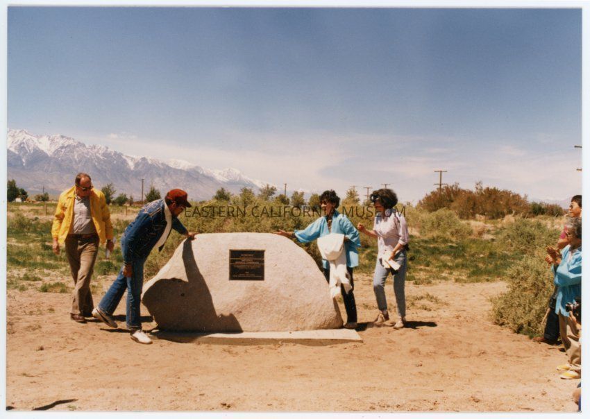 Photograph of Sue Embry and three others standing near the plaque marking Manzanar Incarceration Camp as a National Historic Landmark. The Sierra Nevada can be seen in the left background. On the right two people are clapping and a photograph is aimed their way.Collection