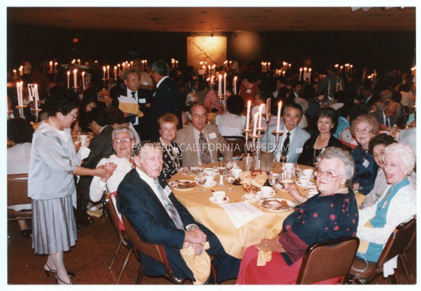 Photograph of Ralph "Pete" Merritt and his family with Mary (Kageyama) Nomura and her familiy seated around a table at the Manzanar 40th Reunion. A full banquet hall can be seen behind them.Collection