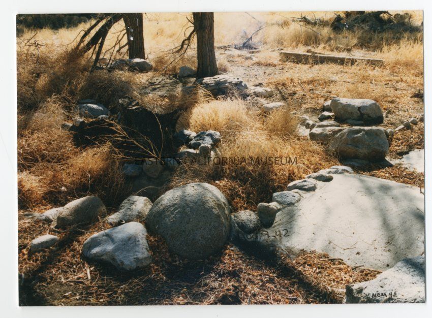 Color photograph of remains of pond, rocks, and concrete bridge at Block 22 garden. Inscribed into the surface of the concrete is the date "Aug. 9, 42."Photograph Details