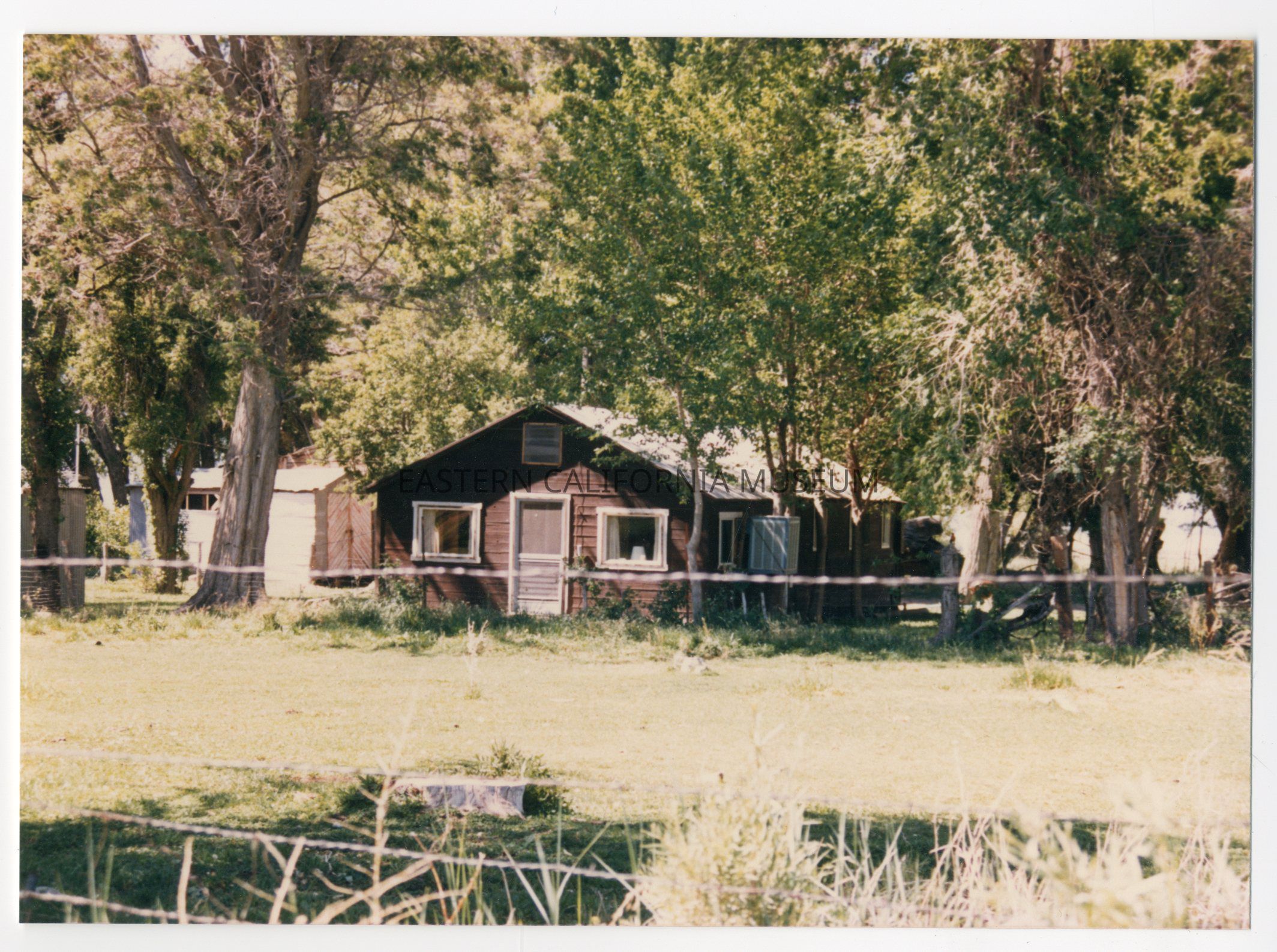 Color photo of a brown painted cabin surrounded by trees. Perhaps it was from Manzanar? Written in blue ink on reverse: #1 5/20/86.