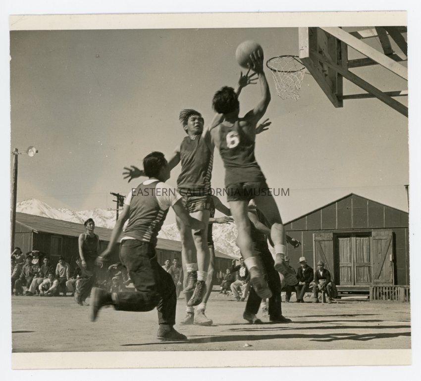 Photo of boys playing basketball at Manzanar War Relocation Center on 02/13/1943.