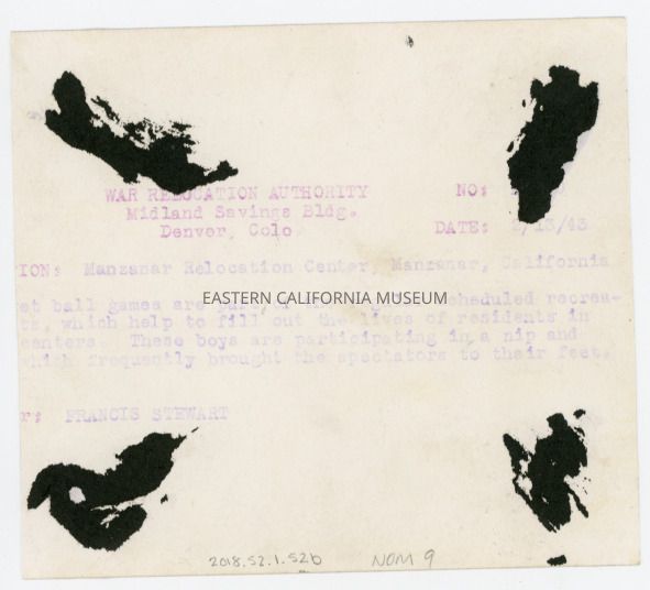 Stamped on reverse with War Relocation Authority information. Description is partially cut off, but says, "[illegible] ball games are part of the regular scheduled recrea- [illegible] which help to fill out the lives of residents in [illegible] centers. These boys are participating in a nip and [illegible] which frequently brought the spectators to their feet. Photographer: Francis Stewart.