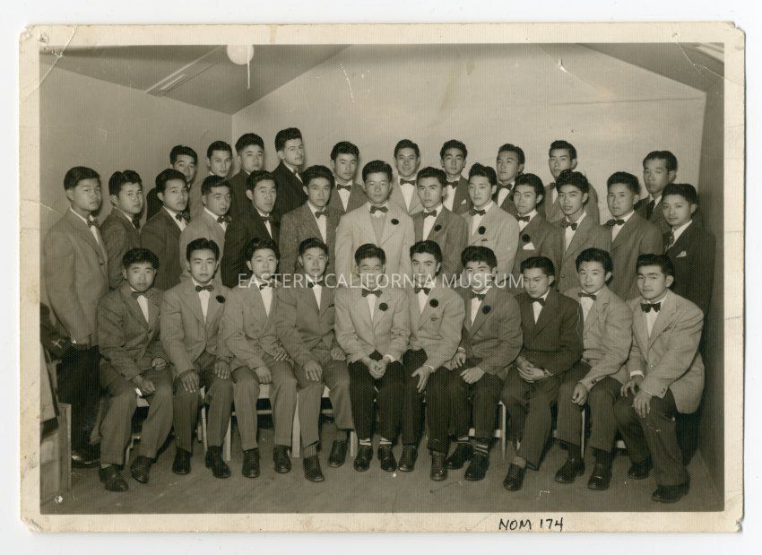 One source (http://www.discovernikkei.org/en/nikkeialbum/items/812/) says: "This picture may have been taken in January 1944. Standing left to right, top: Ray Mochizuki, Nob Hino, Harry Kikuta, Ralph Lazo (a Mexican American who followed his friends into the camp), Larry Honda, Tak Kitaoka, Jim Yamaguchi, Sam Sanada, Nori Kuroyama, Min Watanabe. Standing, middle: George Sakamoto, Louie Sakamoto, Joe Okabe, Saburo Kuwahara, Tosh Terasawa, Kow Maruki, Shig Okada, George Kanemoto, Hank Sakae, Ets Hochi, George Maeda, Kuniyoki Sakamoto, Leon Miyazako. Seated: Min Imai, Senzo Nishida, Yoshindo Shibuya, Charley Nakamura, Jun Okimoto, Luther Miyazaki, Joe Iwaki Takahashi, Iwao Takamoto, Seichi Torii, and Bruce Kaji."Photograph Details