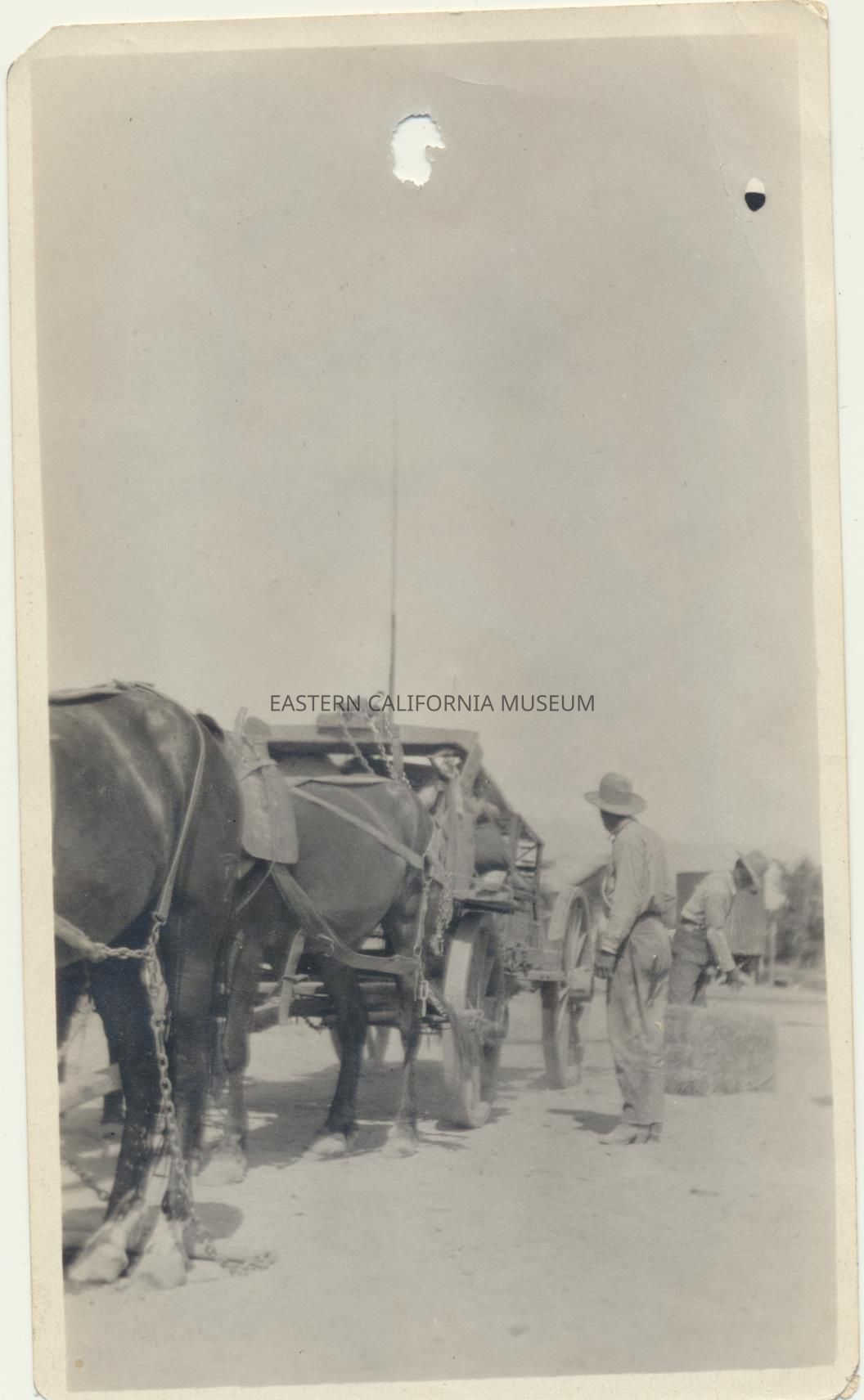 Photo of two men next to a team of at least four horses hauling a wagon [or machine? hay baler?]. The man in the back is looking at a bale of hay.