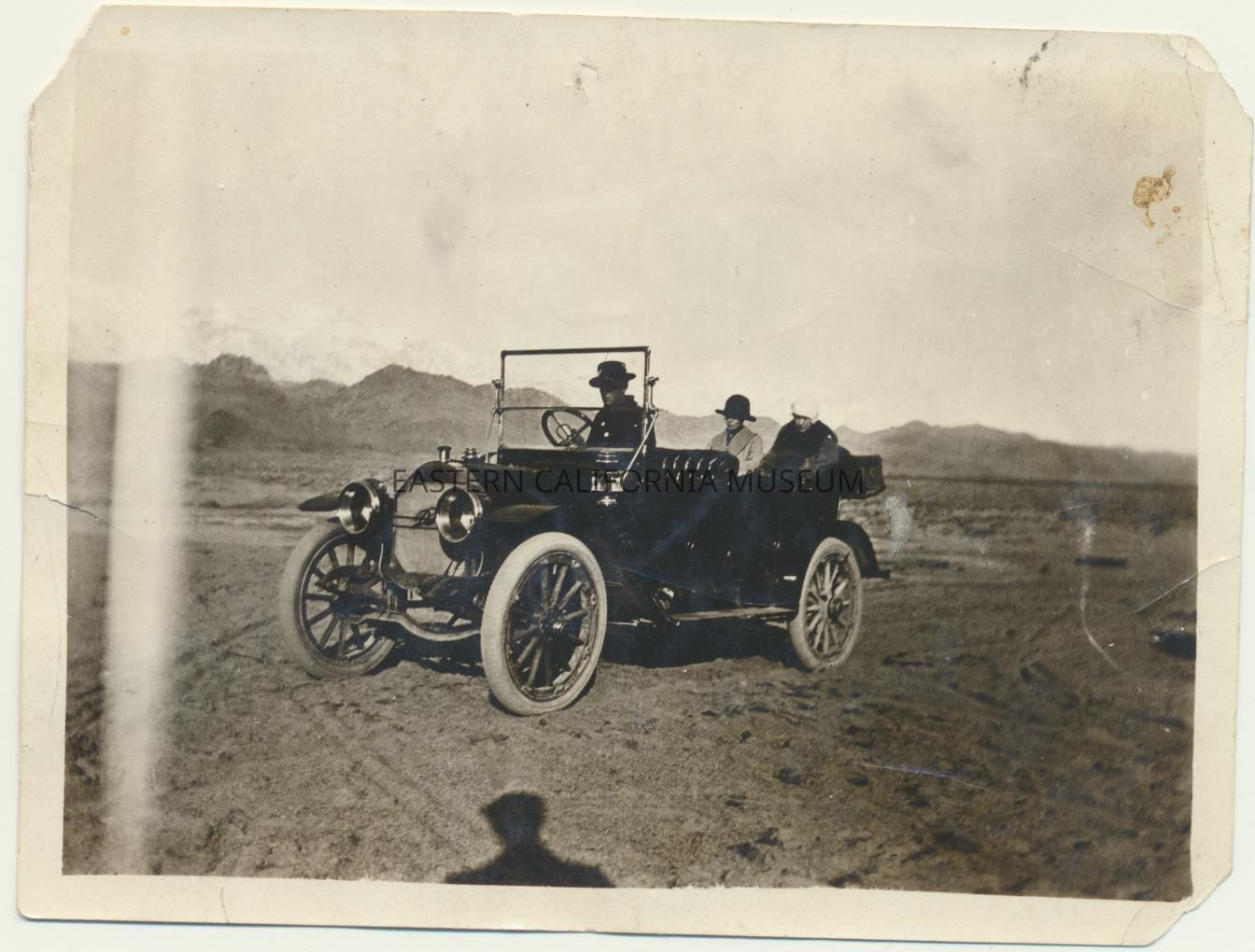 Photo of three people in an early vehicle. Snow covered mountains in background. Location is probably the Callaway Ranch in Inyokern.