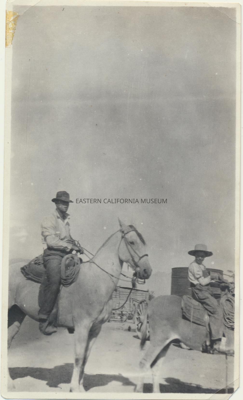 Photo of J. D. Callaway and Arthur "Art" Callaway on horseback (Art might be on a mule). Water tank visible in background. Location is likely the Callaway Ranch in Inyokern.Collection