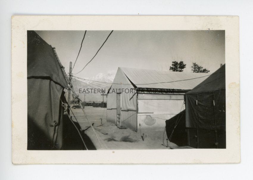 Small black and white photo of an alley between tents with power lines, trees, and Sierras. Barracks visible in background.