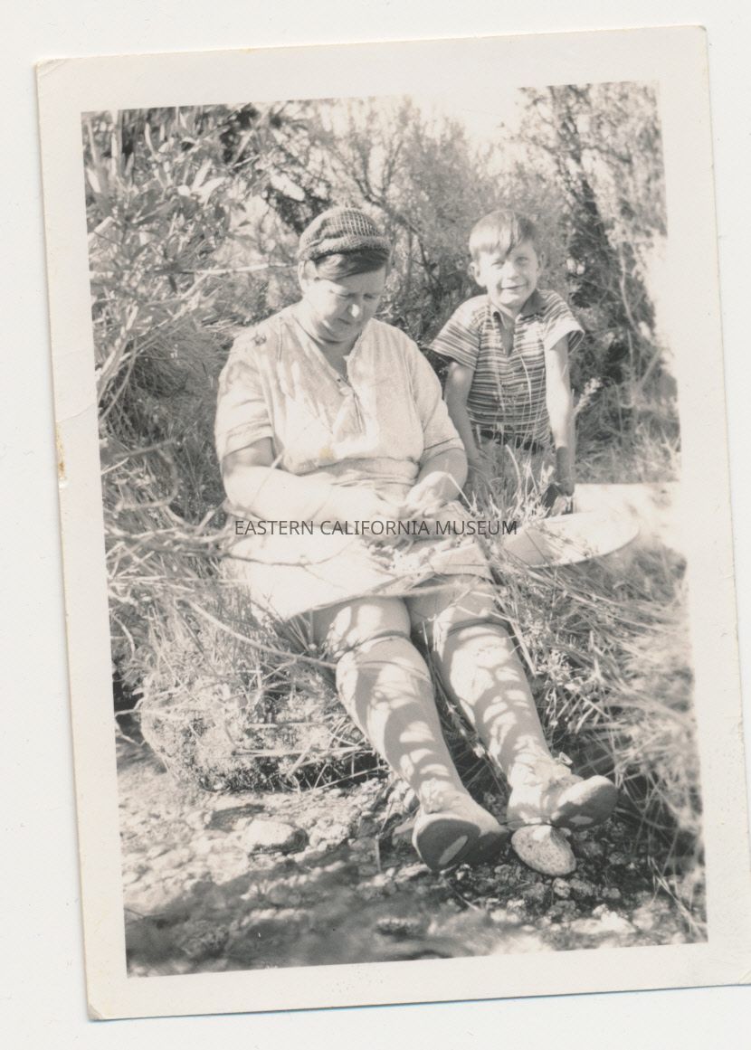 Photo of a woman seated in brush, possibly shelling beans or peas, while a young boy in a striped shirt stands behind her. There is a pot to her left.