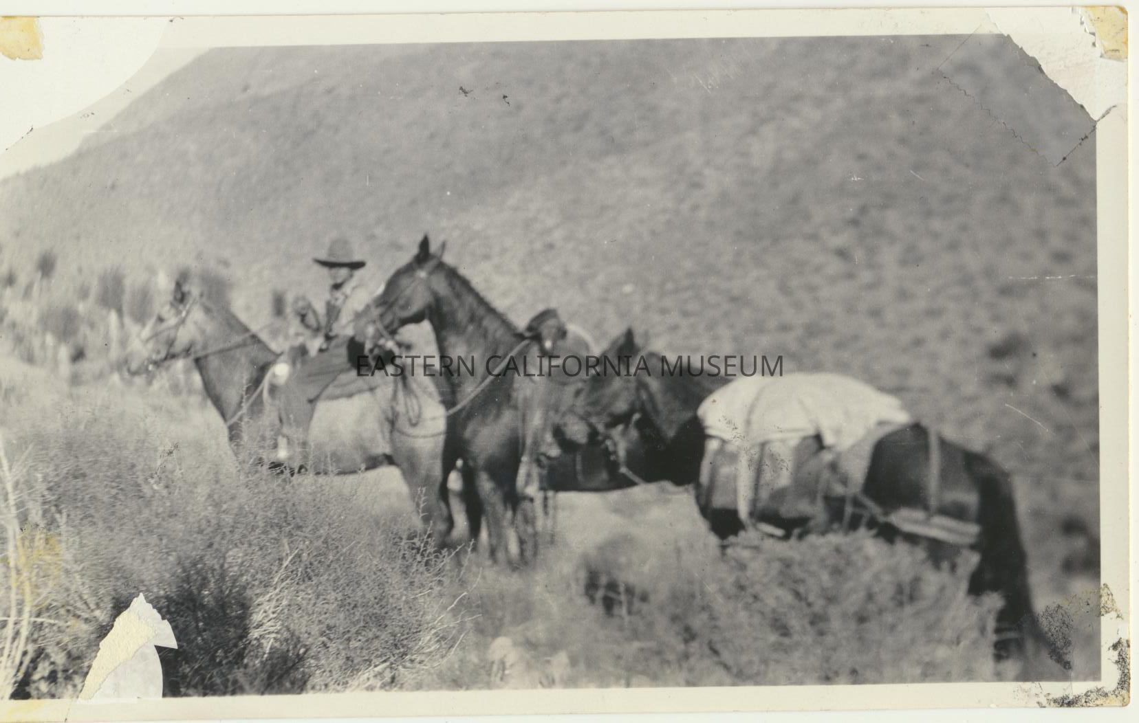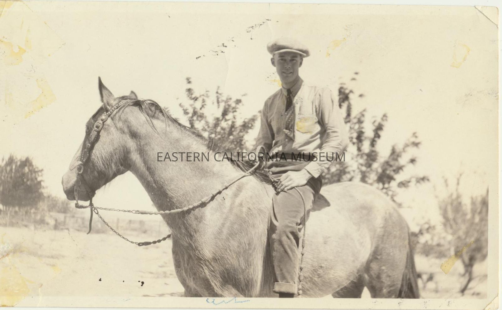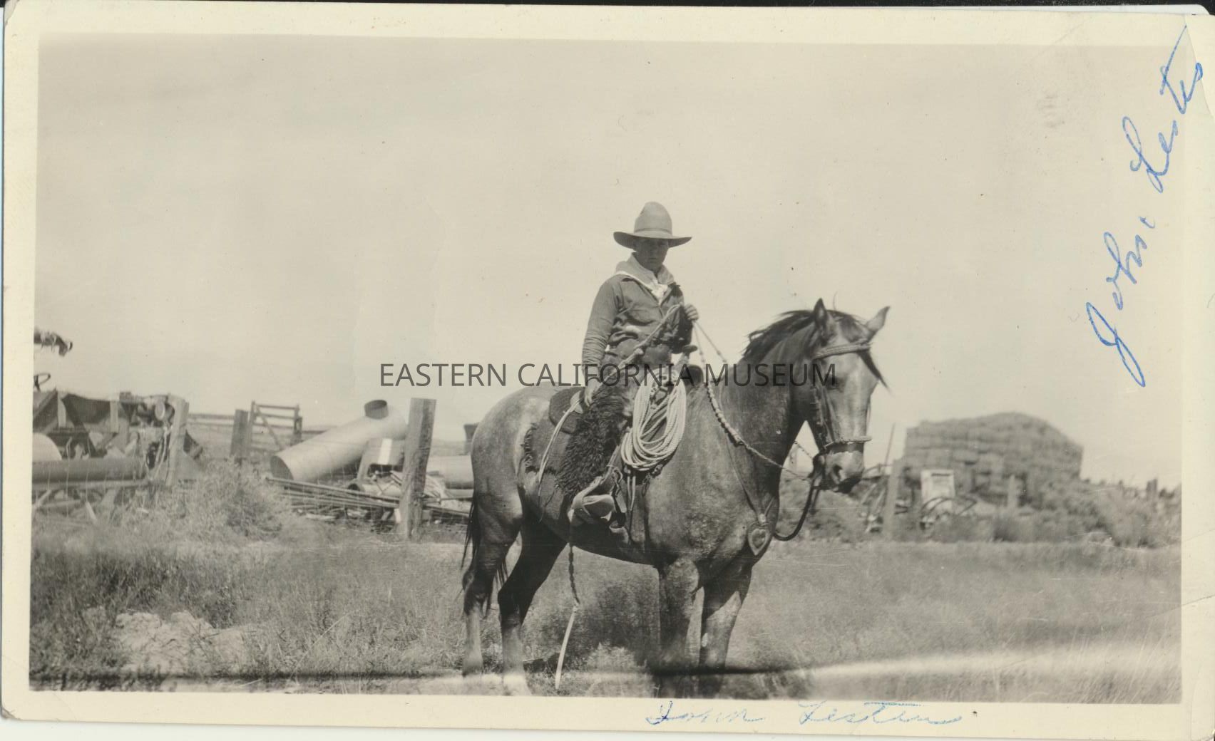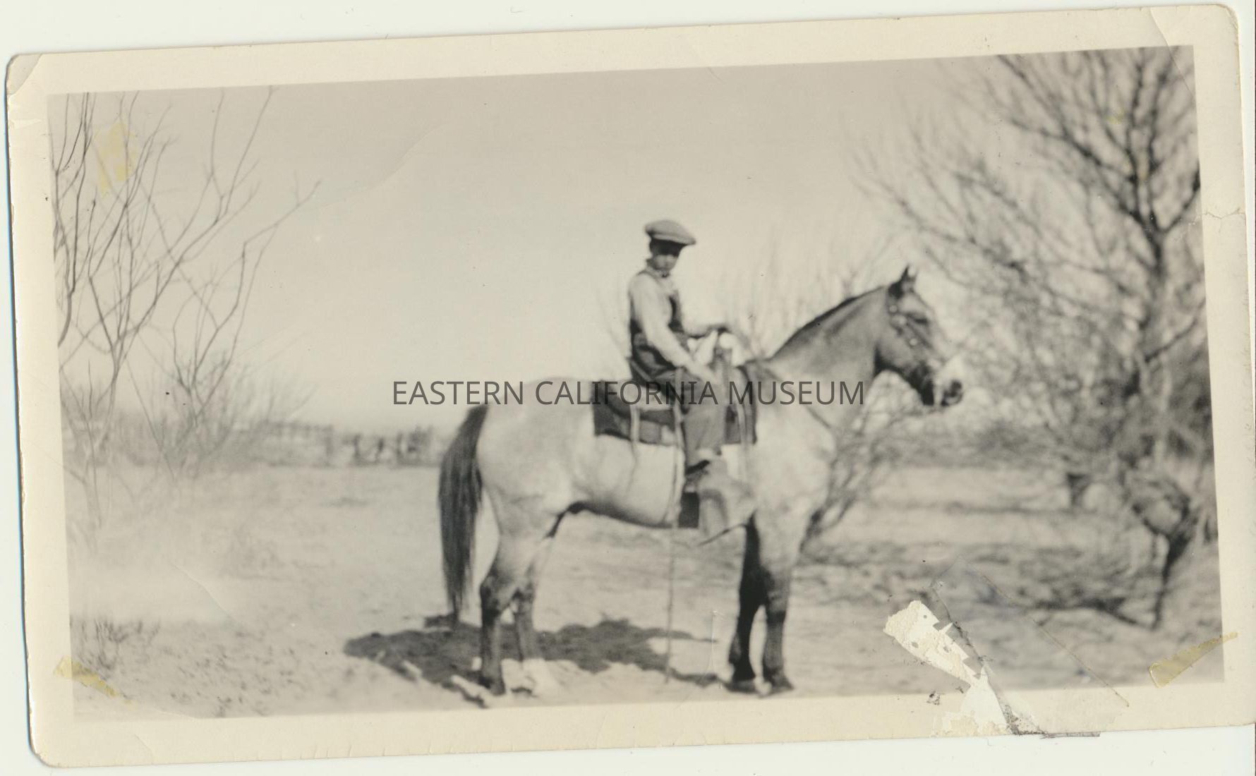 1995.12.34.46b--John Lester Morris on Buck at Inyokern Ranch. He is wearing wooly chaps (angora?).