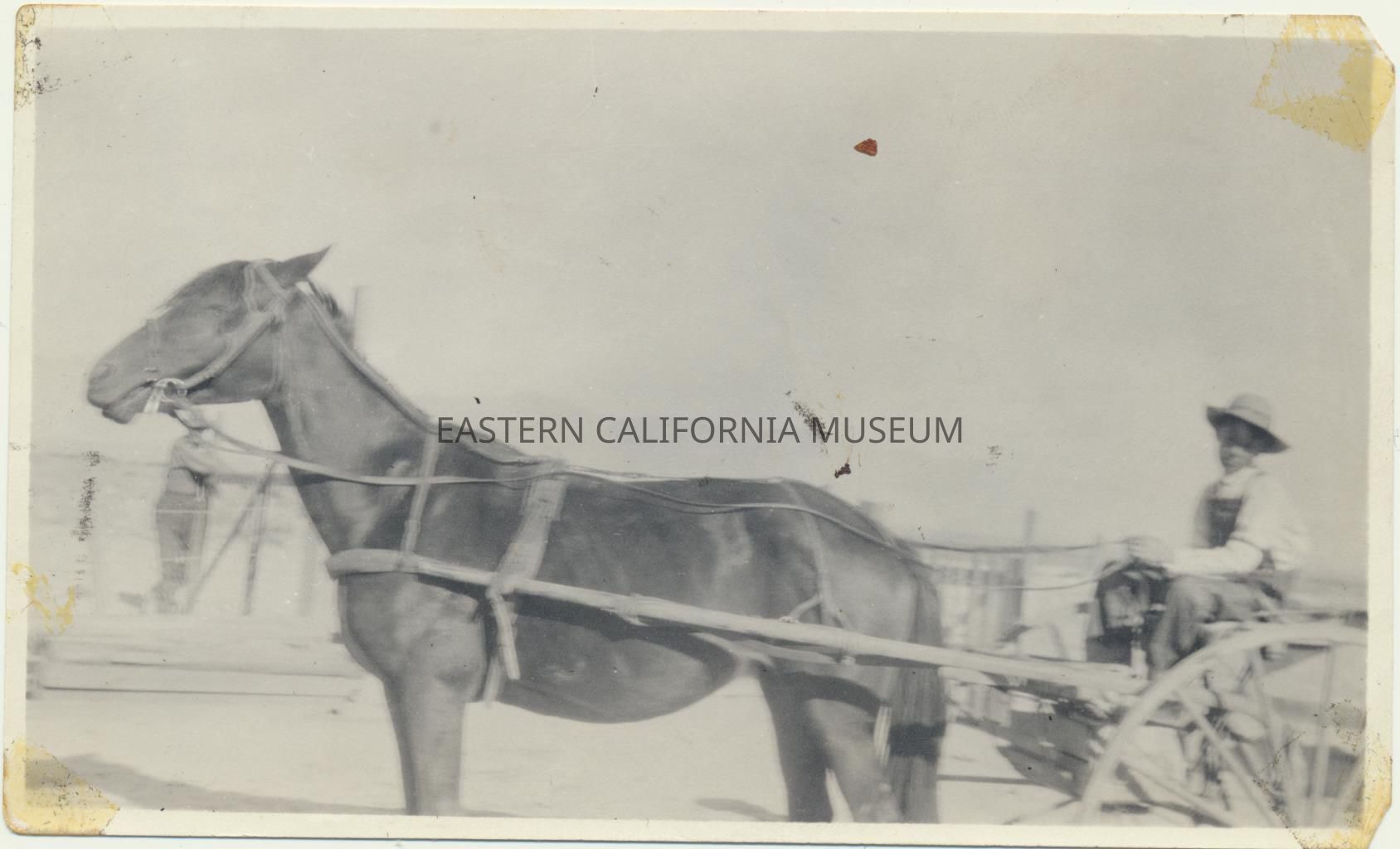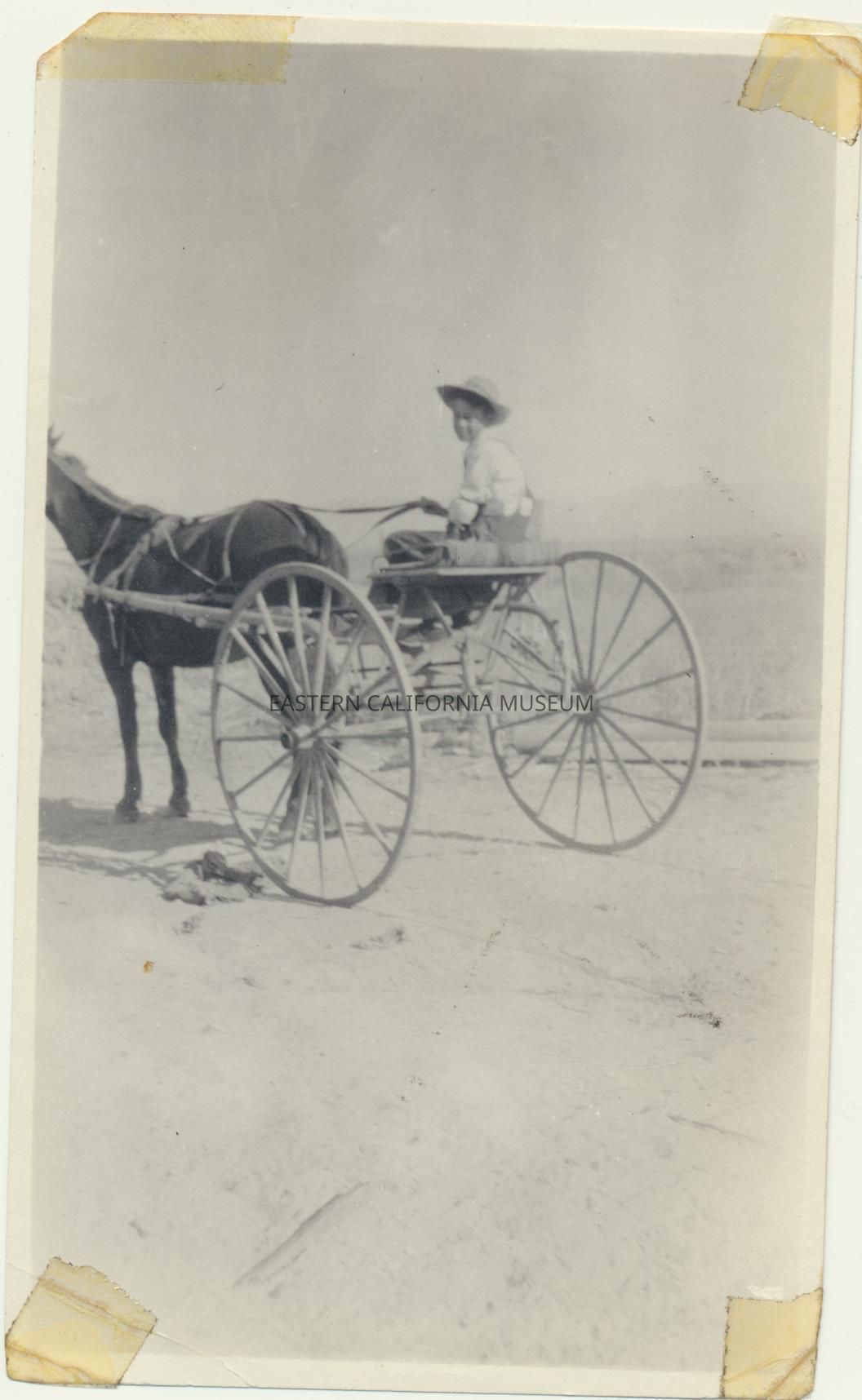 Note on archival envelope says the caption of these photos in the original album was "Inyokern. Arthur, Dot, and buggy leaving for Leliter School."Collection