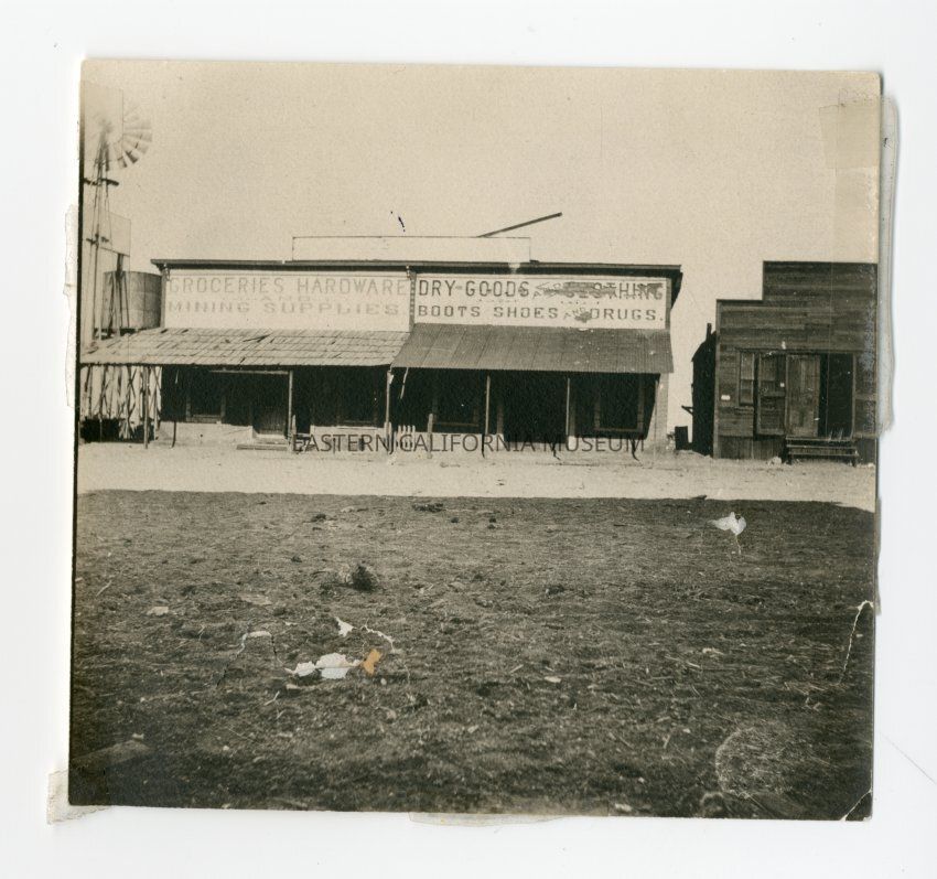 Small black and white photo of two or three storefronts. There is a windmill and water tank off to the left. The signs on the stores say, "Groceries Hardware and Mining Supplies" and "Dry Goods and [illegible "thing"] Boots Shoes and Drugs."