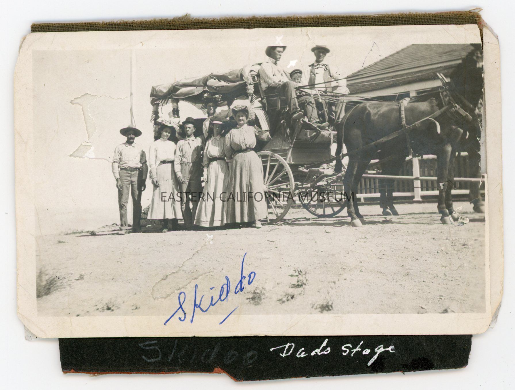 Photo of a group of eight people on and around a decorated stagecoach in front of a building. Two of the people have "X"s over their heads. This photo is affixed to the cover of a photo album. Someone has written along the bottom of the image in blue ink "Skidoo" and below that on the album cover "Dad's stage."