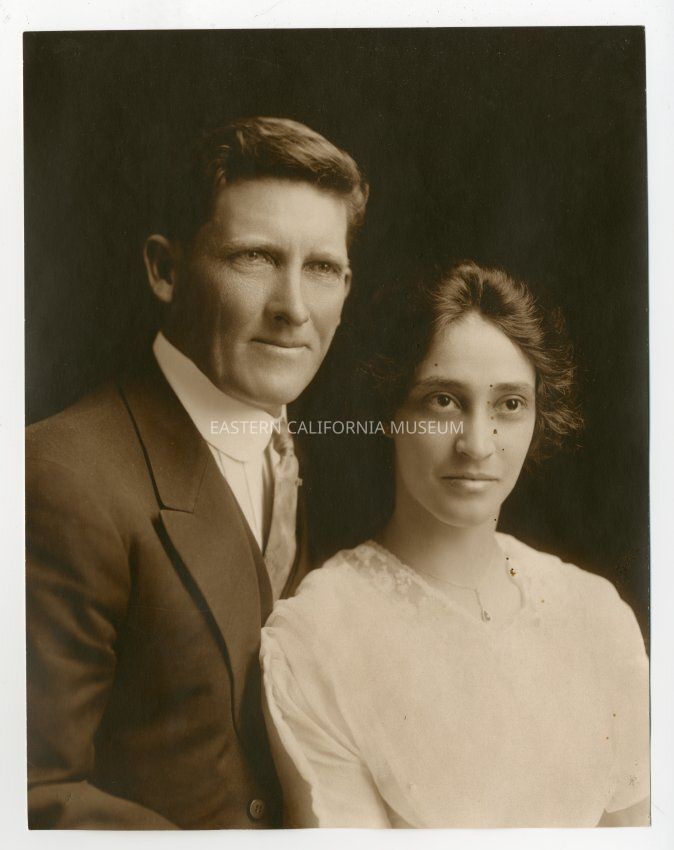 Studio portrait of Fred and Marvel Schabbell. She is wearing a white dress with lace around the neckline and a pendant necklace. He is wearing a three piece suit with a high, rounded collar with a tie and tie pin.Collection
