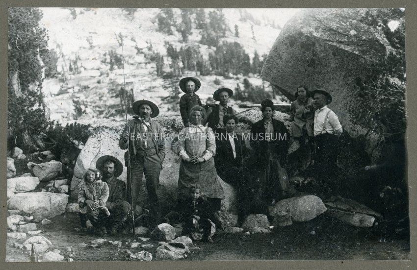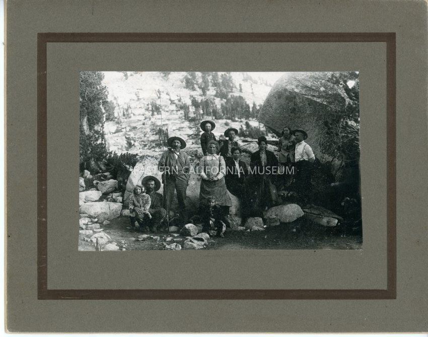 Mounted photo of a large group of people (eleven total) in the wilderness, possibly Yosemite. One man holds a fishing pole as they pose around large boulders.