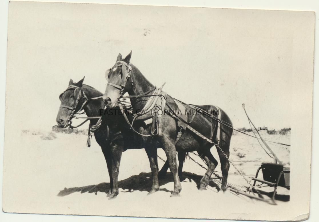 Photo of two black horses harnessed up to some unidentified equipment. Location is probably the Callaway Ranch in Inyokern.
