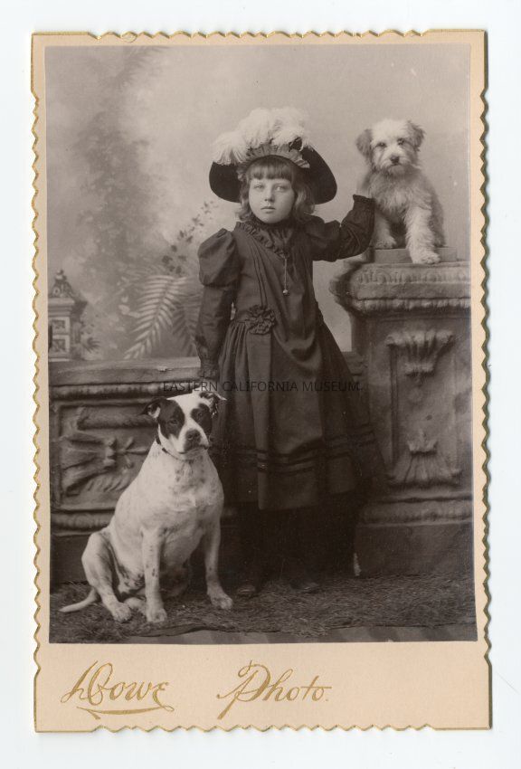 Mounted photograph of Nettie Lee Irwin posing with with two dogs. Photo is by Dowe and the sides of the mount are scalloped and gilded.