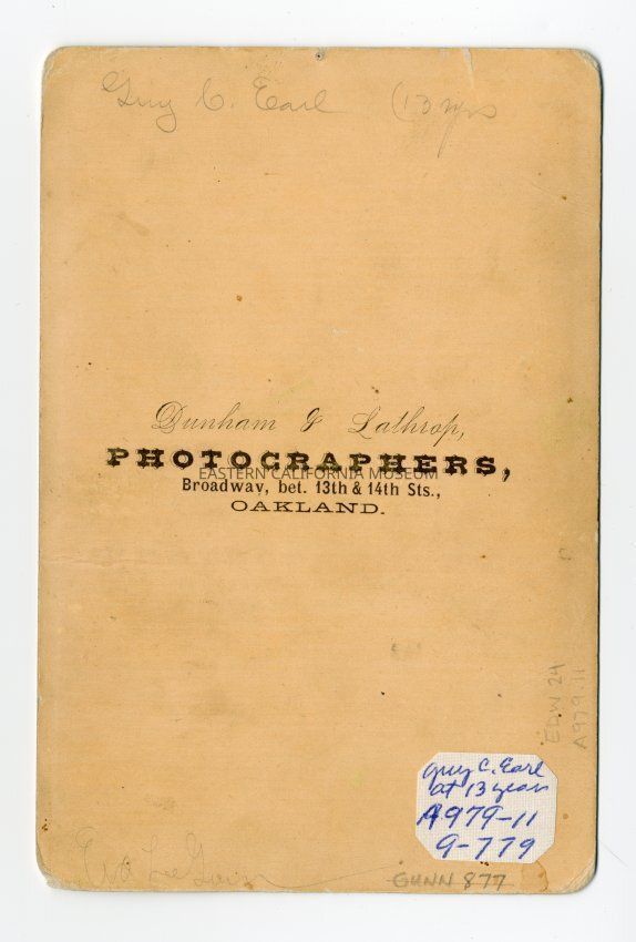 Mounted photograph of Guy C. Earl, aged 13 years old. Photograph by Dunham & Lathrop of Oakland.