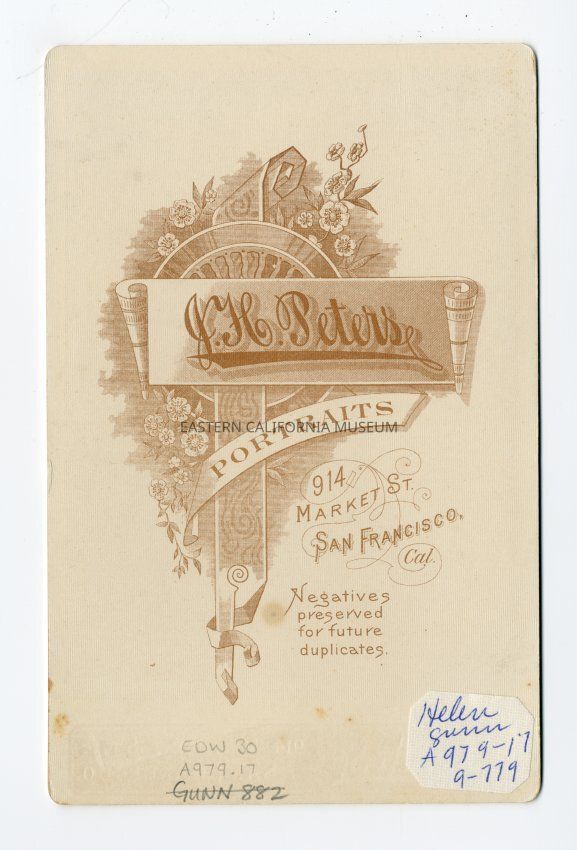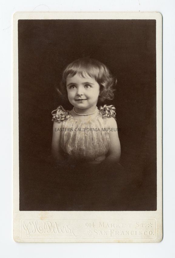 Mounted photo of Helen Gunn as a child. She is wearing what appears to be a pearl necklace and a gauzy dress with posettes on the shoulders. Photographed by J. H. Peters of San Francisco.Collection