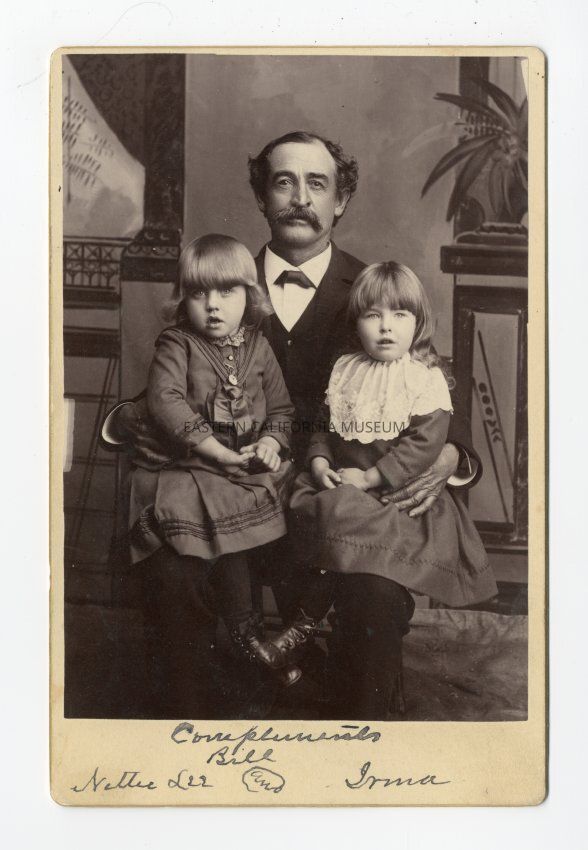 Mounted photo of a man with two daughters sitting on his knees. From left to right: Nettie Lee Irwin, Bill Irwin, and Irma Irwin. Handwritten in black ink below the photo is: "Compliments Bill, Nettie Lee, and Irma."Collection