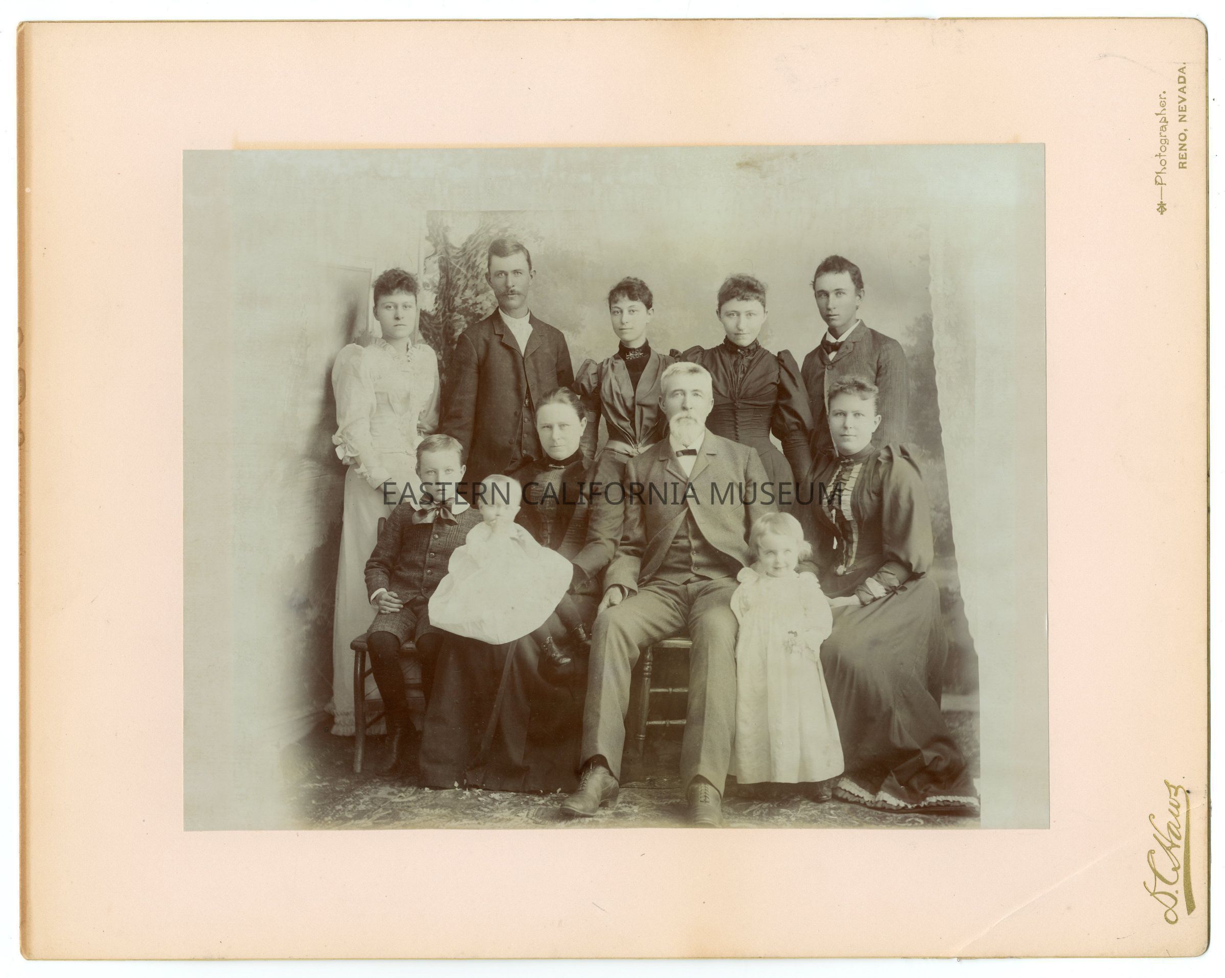 Mounted studio portrait of the John Shepherd family. Photographer was D. C. Haws of Reno, NV.