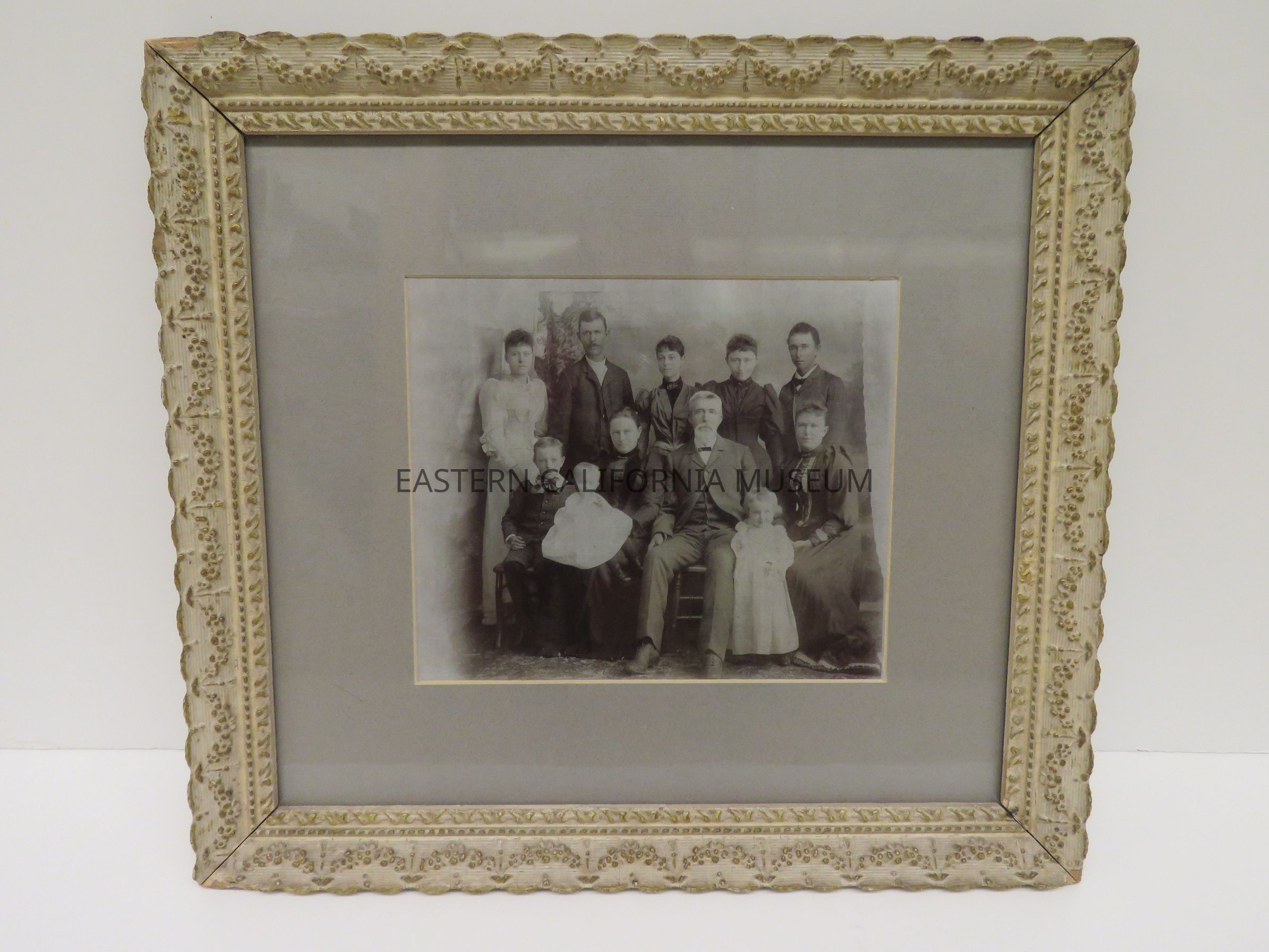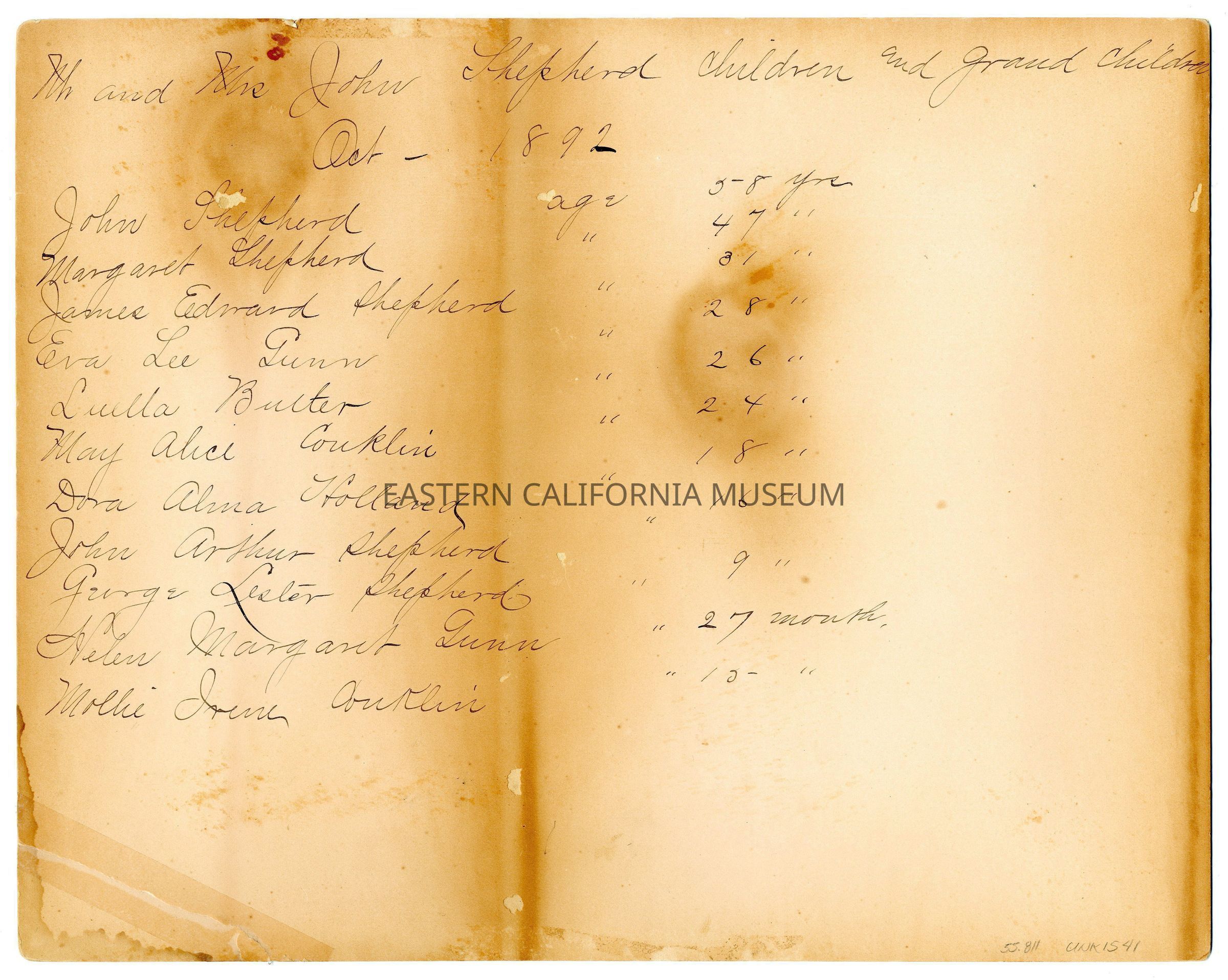 Written in ink on reverse: Mr. and Mrs. John Shepherd children and grand children. Oct. 1892. John Shepherd age 58 yrs., Margaret Shepherd, age 47 yrs., James Edward Shepherd, age 31 yrs., Eva Lee Gunn, age 28 yrs., Luella Butler, age 26 yrs., May Alice Conklin, age 24 yrs., Dora Alma Holland, age 18 yrs., John Arthur Shepherd, age 16 yrs., George Lester Shepherd, age 9 yrs., Helen Margaret Gunn, age 27 months, Mollie Irene Conklin, age 15 months.