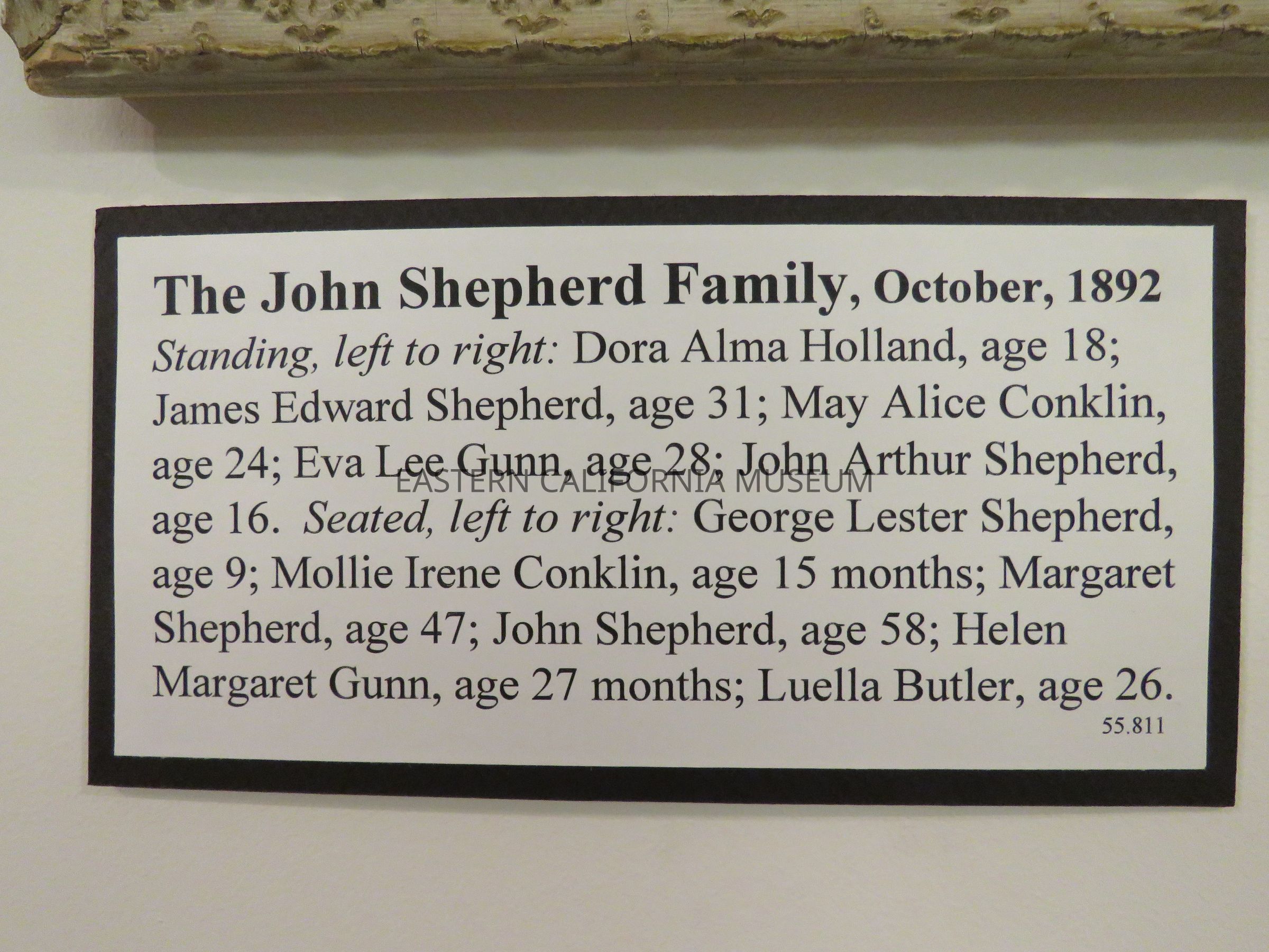Interpretative label gives the following information: Standing left to right: Dora, Ed May Conklin, Eva Lee Gunn, Arthur. Seated left to right: Lester, Mrs. John Shepherd holding Rena Conklin, John Shepherd, Helen Gunn standing at his knee, Luella Butler.Collection