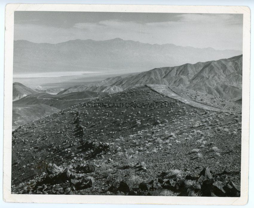 Written on reverse: Padre Crowley Point--Paso Por Aqui. Named for the beloved Padre of the Desert Monsignor [Monseigneur] John J. Crowley, 1891-1940. Located on Highway 190 Lone Pine Death Valley Road. Telescope Peak in Panamint Mountains in background. Helen Gunn Edwards, Box 728, Truckee, Calif.