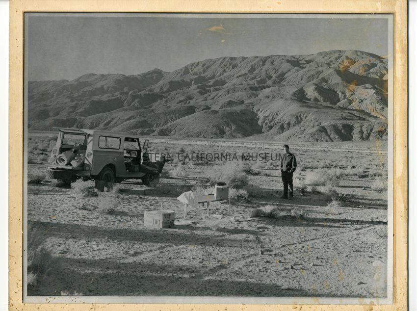 Mounted photograph of a man, jeep, and a cot or table with boxes (supplies?). Mountains background.