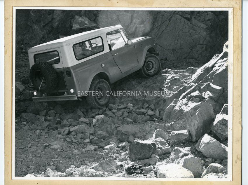 Mounted photograph labeled on reverse: "7/6/2019 Mengal Pass, Inyo Co., c. 1961. Climbing the dry waterfall. Donated by Glen McDonald (his jeep)." Photo is of a jeep that appears to be driving up a rocky slope.Collection