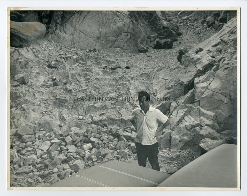 Photo labeled on reverse: "7/6/2019 Donated by Glen McDonald (pictured). Mengel Pass, Inyo Co., Death Valley, c 1961." Photo of man standing next to a jeep (roof and hood visible).Collection