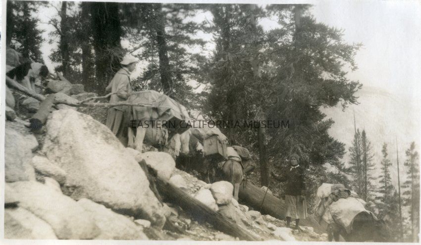 Identified by donor as: 1914 - Patti George right with pack mules - unknown location, unknown woman