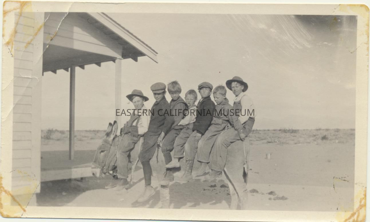 Photo of seven young boys on one mule in front of the Brown School.