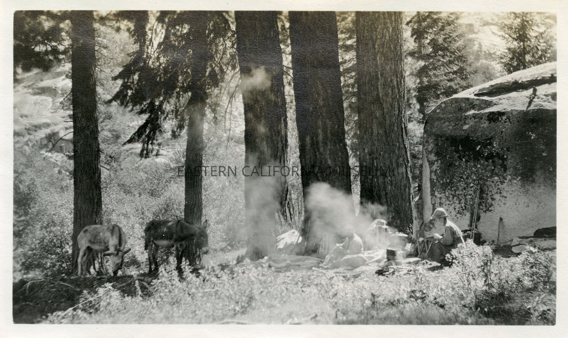 Photo of two people resting at a campfire at the base of a large boulder. Two pack mules are nearby.